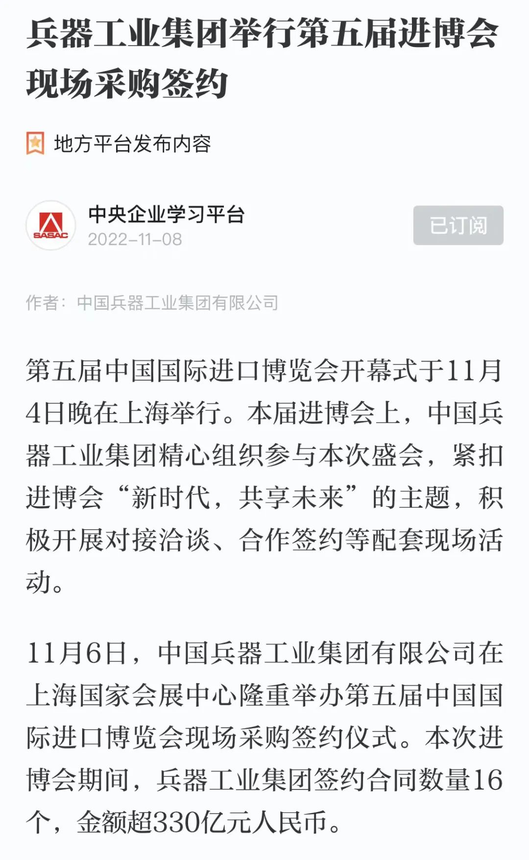 學(xué)習(xí)強(qiáng)國(guó)中央企業(yè)學(xué)習(xí)平臺(tái):兵器工業(yè)集團(tuán)舉行第五屆進(jìn)博會(huì)現(xiàn)場(chǎng)采購(gòu)簽約
